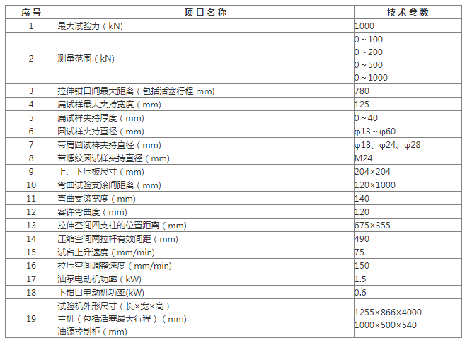 ●WE-1000A型液壓式萬能試驗機(jī)主要技術(shù)規(guī)格及參數(shù):